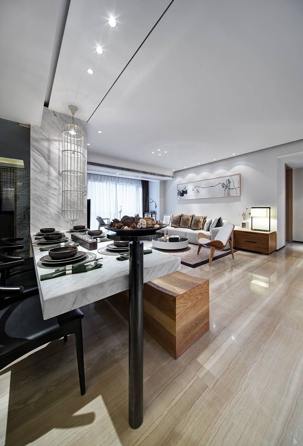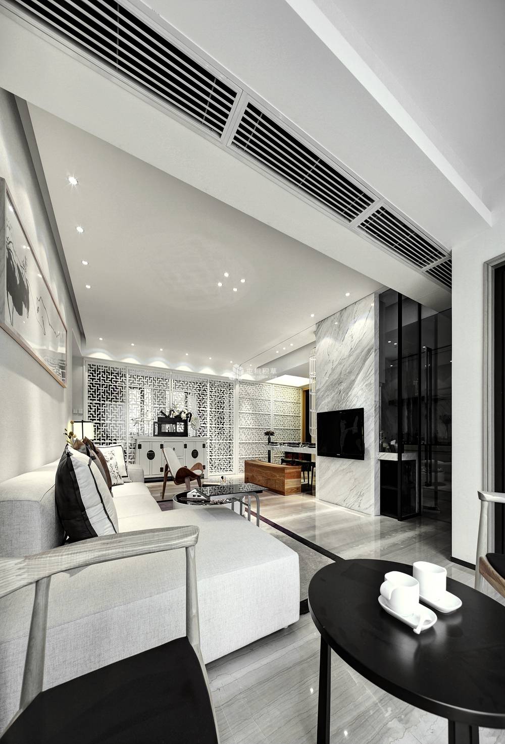 新中式风格融合了现代化元素的时尚简洁和传统中式元素的神韵。好比室内空间墙上的挂画采用水墨画,用深深浅浅、有浓有淡的笔触,寥寥数笔就用简单的轮廓和灵动的线条勾勒出主体的神韵。